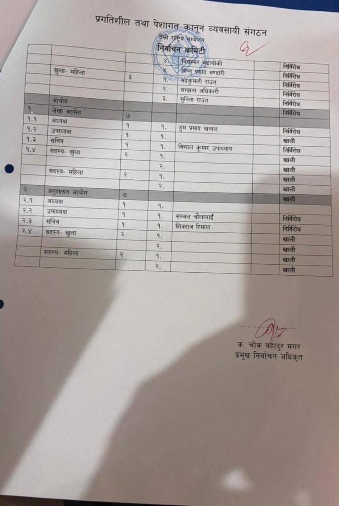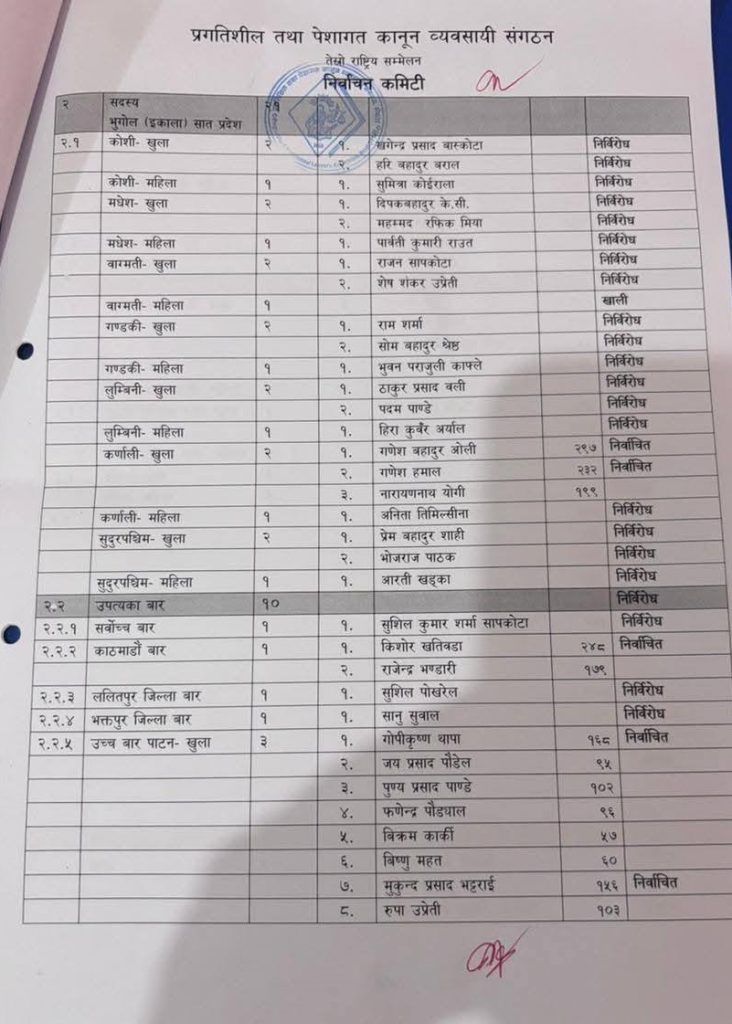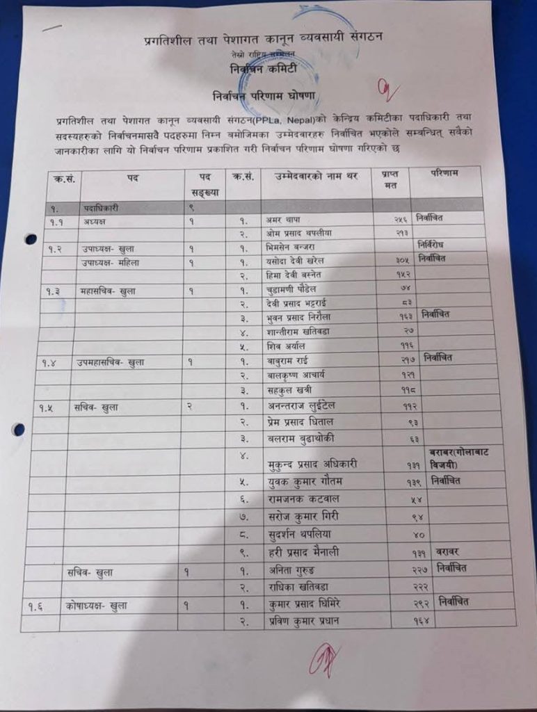 नेकपा (एमाले) निकट प्रगतिशील तथा पेशागत कानून व्यवसायी संगठन (पिपिएलए) को अध्यक्षमा वरिष्ठ अधिवक्ता अमर थापा निर्वाचित भएका छन् । थापा २५६ मत प्राप्त गरी अध्यक्ष निर्वाचित भएका हुन् । उनका प्रतिद्वन्द्वी ओमप्रसाद थपलियाले २१३ मत प्राप्त गरे । जो संस्थापनका उम्म्ेदवार थिए ।