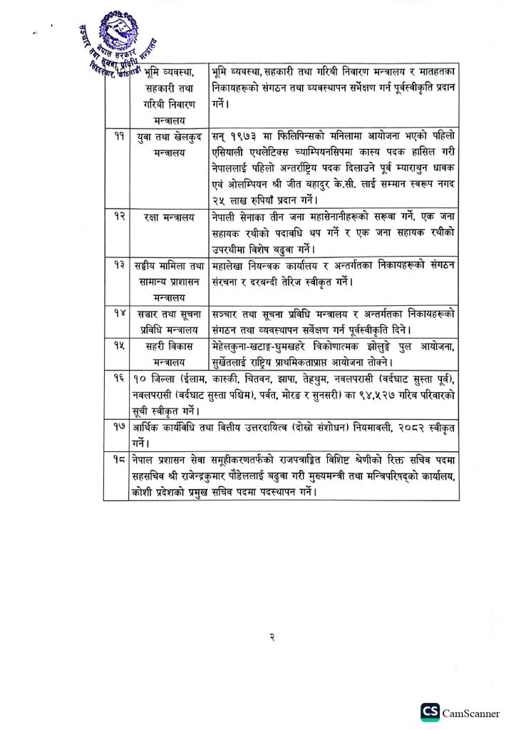 चैत १५ गते राजावादी आन्दोलनको क्रममा ज्यान गुमाएका पत्रकार सुरेश रजकलाई शहीद घोषणा गरिएको छ । त्यस्तै यातायात क्षेत्रबारे सर्वोच्च अदालतका आदेशहरू कार्यान्वयन गर्न दिपक सुवेदीको नेतृत्वमा शरद अधिकारी र योगेन्द्रनाथ कर्माचार्य सदस्य रहेको जाँचबुझ आयोग गठन गरिएको छ ।