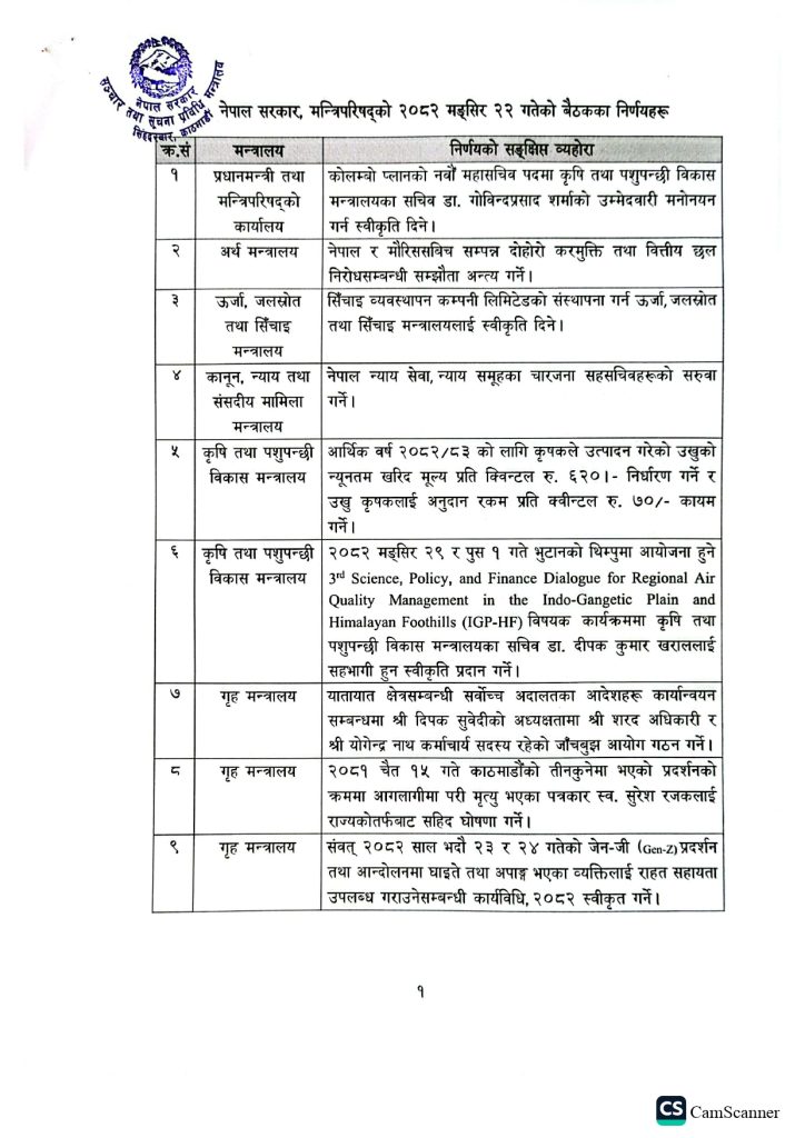 मन्त्रिपरिषद्को हिजो सोमबारको बैठकले गरेका १८ वटा निर्णय सार्जजनिक गरिएको छ । सञ्चारमन्त्री जगदीश खरेलले आज पत्रकारमाझ ती निर्णय सार्वजनिक गरेका हुन् ।