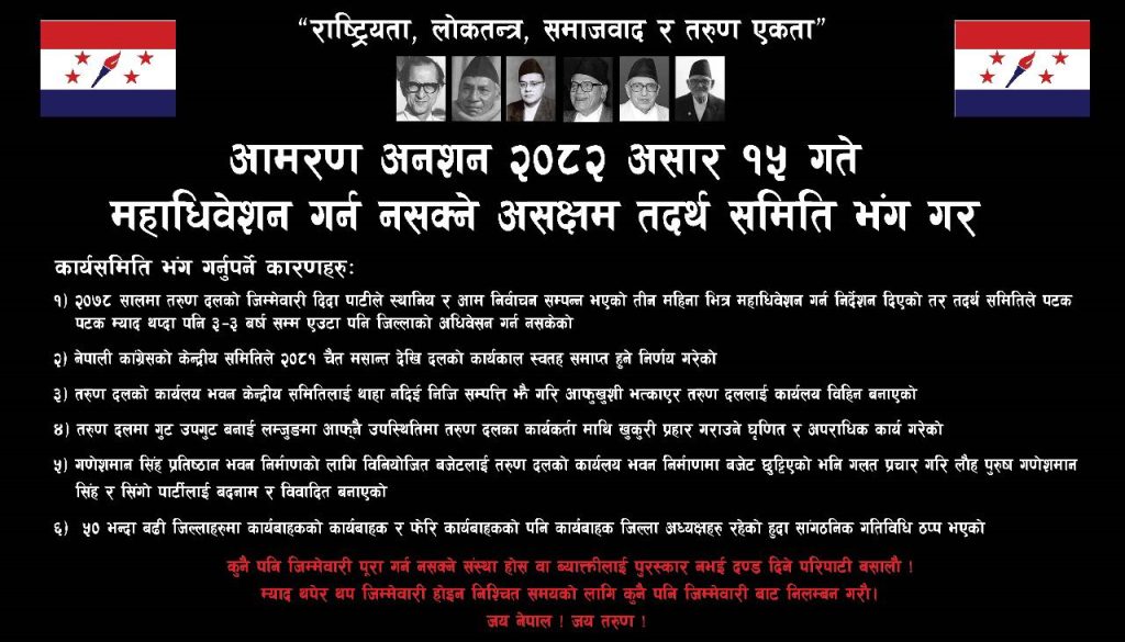 पटक-पटक मिति थप गर्दा पनि नेपाल तरुण दलको महाधिवेशन गर्न असक्षम रहेको भन्दै तदर्थ समिति अध्यक्ष विद्धान गुरुङलाई बर्खास्त गर्ने मागसहित नेपाली कांग्रेसको केन्द्रीय कार्यालय सानेपामा आमरण अनसन सुरू भएको छ । सानेपास्थित कांग्रेस केन्द्रीय कार्यालय परिसरमा तरुण दल केन्द्रीय सदस्यहरू रोजन राई र अम्बिका बास्कोटाले आमरण अनसन सुरु गरेका हुन् ।