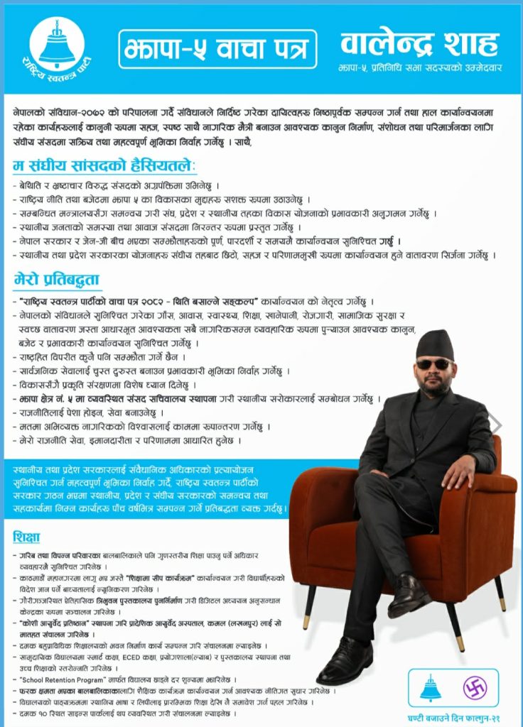 राष्ट्रिय स्वतन्त्र पार्टी (रास्वपा) बाट झापा क्षेत्र नम्बर- ५ का प्रतिनिधि सभा सदस्य उम्मेदवार बालेन्द्र शाह (बालेन) ले आज सोमबार बिहानै आफ्नो चुनावी प्रतिबद्धता पत्र (वाचापत्र) सार्वजनिक गरेका छन्।