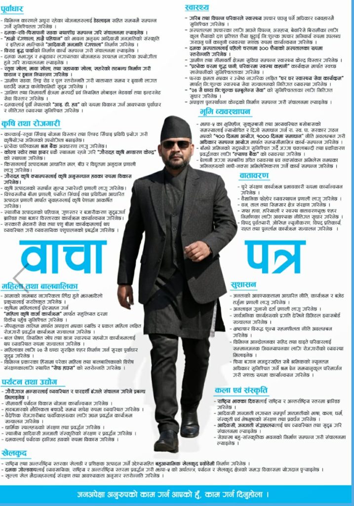 महिला उद्यमीका लागि सहुलियतपूर्ण ऋण, ‘सेफ हाउस’ को व्यवस्था र युवाहरूका लागि सीपमूलक तालिममार्फत स्वरोजगार सिर्जना गर्ने लक्ष्य राखिएको छ। गौरादह कृषि क्याम्पसलाई अनुसन्धान केन्द्रका रूपमा विकास गर्ने र दमकलाई ‘पर्यटन ट्रान्जिट हब’ बनाउने योजना पनि वाचा पत्रमा समेटिएको छ।