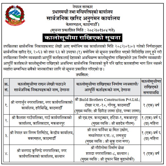 ती निर्माण कम्पनीलाई एक वर्षसम्म कालो सूचीमा राखिएको उल्लेख छ। (हेर्नुहोस् सूचना)