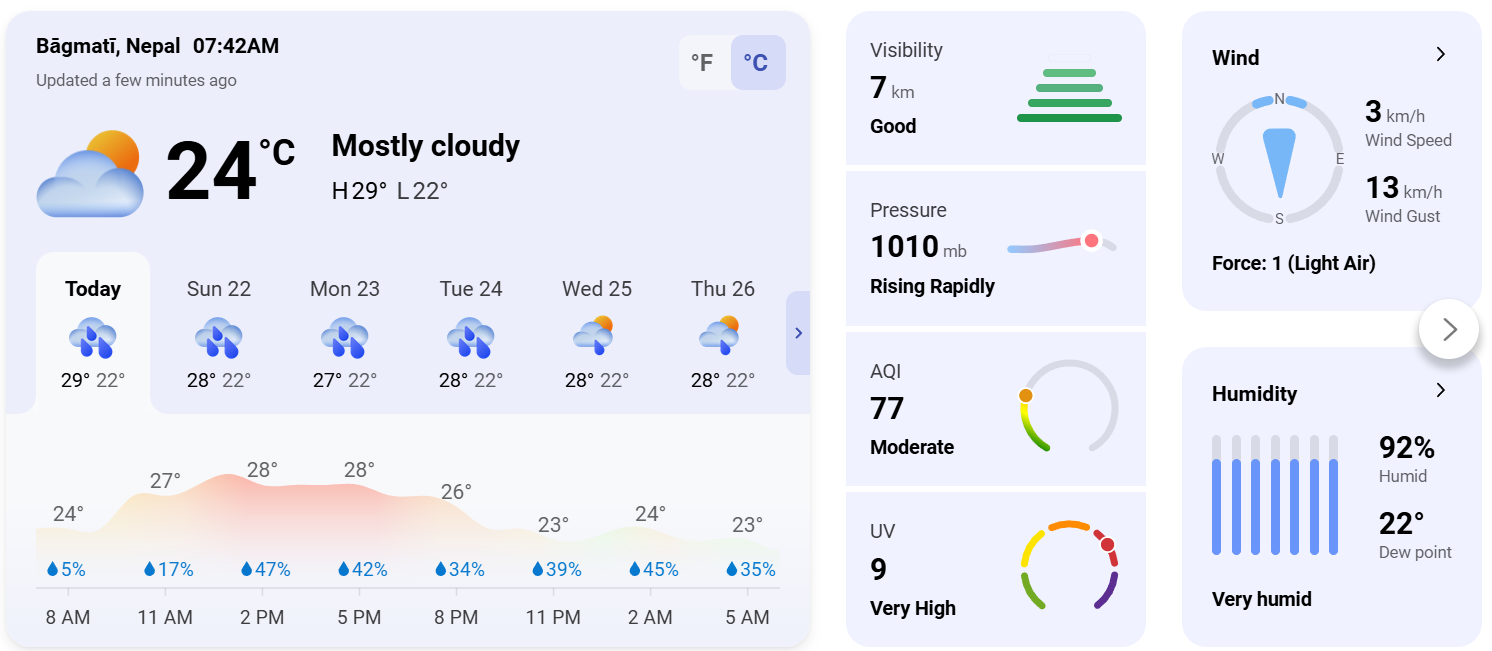 दिउँसो देशभर आंशिक देखि साधारणतया बदली रहनेछ। देशको पहाडी भू-भागको केही स्थानहरुमा तथा बाँकी भू-भागको थोरै स्थानहरुमा मेघगर्जन र चट्याङ सहित हल्का देखि मध्यम वर्षाको सम्भावना रहेको छ । कोशी प्रदेश,बागमती प्रदेश र गण्डकी प्रदेशका एक दुई स्थानमा भारी वर्षाको पनि सम्भावना रहेको छ। देशका उच्च-पहाडी तथा हिमाली भू-भागका थोरै स्थानहरू हल्का वर्षा र हिमपातको सम्भावना रहेको छ। कोशी प्रदेश र मधेश प्रदेशका तराइका भू-भागहरुका थोरै स्थानहरुमा हावाहुरीको सम्भावना रहेको छ।