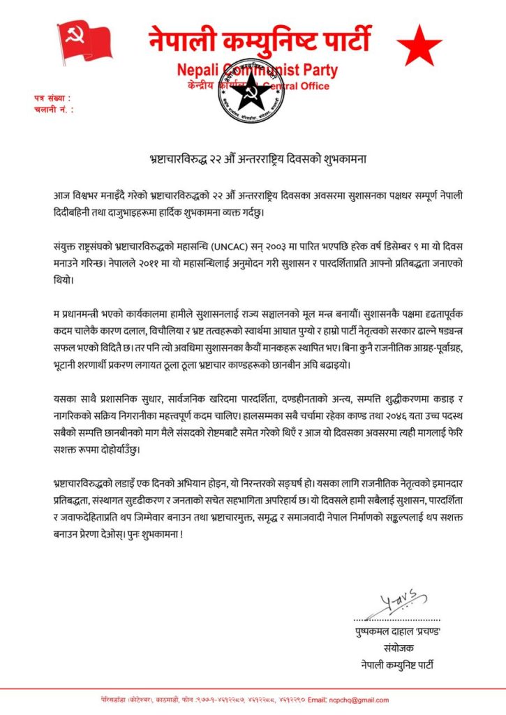 भ्रष्टाचारविरुद्ध २२औँ अन्तर्राष्ट्रिय दिवसका अवसरमा मंगलबार शुभकामना सन्देश जारी गर्दै संयोजक प्रचण्डले सबैको सम्पत्ति छानबिन गर्नुपर्ने कुरा दोहोर्याएका छन् । हालसम्मका सबै चर्चामा रहेका काण्ड तथा २०४६ यता उच्च पदस्थ सबैको सम्पत्ति छानबीनको माग मैले संसदको रोष्टमबाटै समेत गरेको थिएँ र आज यो दिवसका अवसरमा त्यही मागलाई फेरि सशक्त रूपमा दोहोर्याउँछु, प्रचण्डले विज्ञप्तिमा उल्लेख गरेका छन् ।