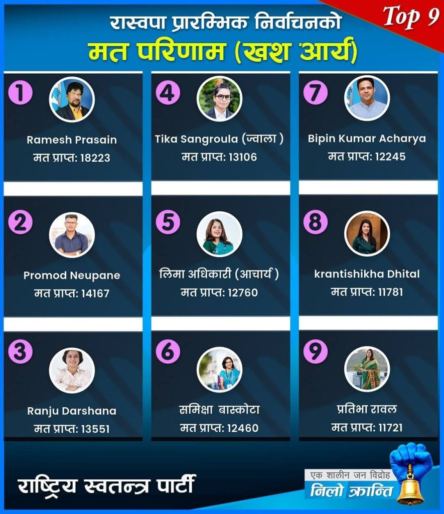 रास्वपाको प्रारम्भिक मत परिणाममा समानुपातिकबाट गायक रमेश प्रसाईंले १८ हजार २२३ सर्वाधिक मत प्राप्त गरेका छन्। प्रसाईंले खस आर्य तर्फबाट समानुपातिकमा उम्मेद्वारी दिएका थिए। खस आर्यतर्फको महिलामा रञ्जु दर्शना १३ हजार ५५१ मत प्राप्त गरेर पहिलो भएकी छन् ।