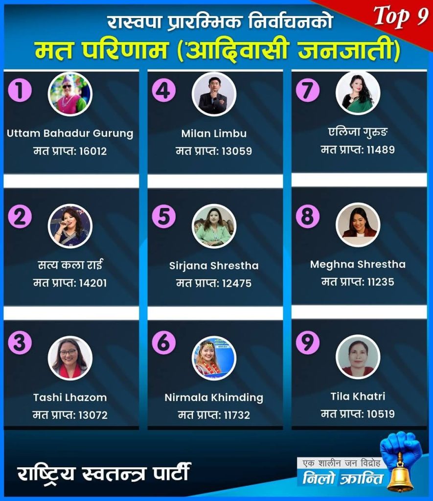 आदिवासी जनजाति तर्फबाट समानुपातिकमा उत्तम बहादुर गुरुङ पहिलो नम्बरमा परेका छन्। रास्वपाको प्रारम्भिक निर्वाचनको मतपरिणाममा गुरुङले १६ हजार१२ मत प्राप्त गरेका हुन्। त्यसैगरी मधेशी तर्फबाट पुनम कुमारी अग्रवालले १५ हजार ७४५ मत प्राप्त गरेकी छन्। दलित तर्फबाट विजय जैरुले १३ हजार १४३ मत प्राप्त गरेका छन्।
