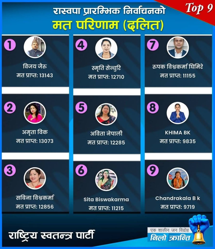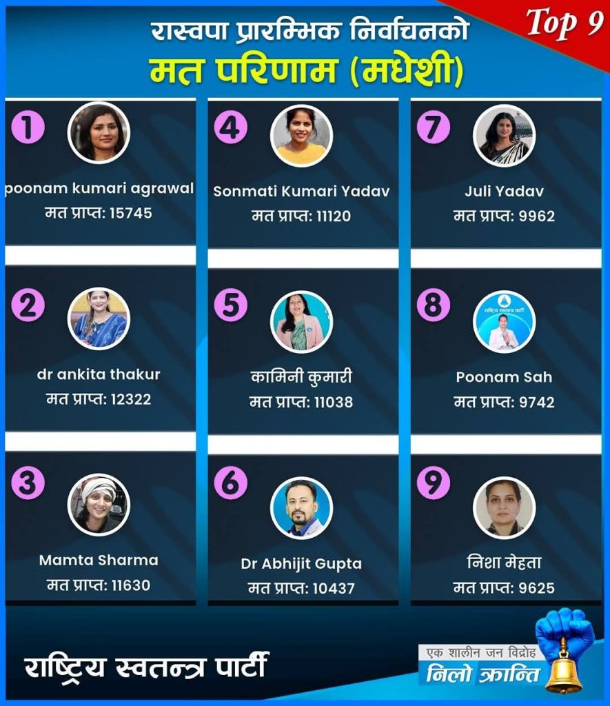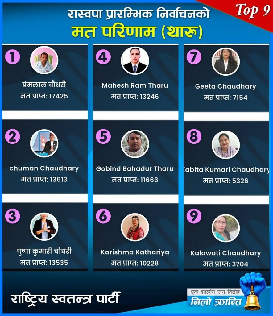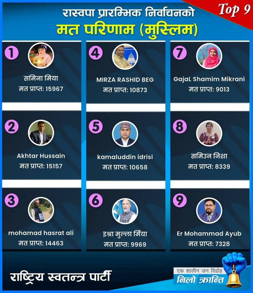 समिना मियाले मुस्लिम क्लस्टरबाट रास्वपाको प्रारम्भिक निर्वाचनमा १५ हजार ९६७ मत प्राप्त गरेकि छन्। थारु क्लस्टरबाट प्रेमलाल चौधरीले १७ हजार ४२५ मत प्राप्त गरेर पहिलो नम्बरमा रहेका छन्।