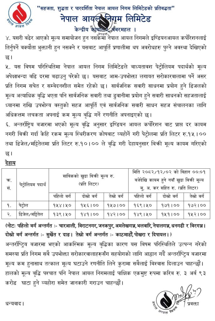 नेपाल आयल निगम लिमिटेडले पेट्रोलियम पदार्थको मूल्यमा भारी वृद्धि गरेको छ । अन्तर्राष्ट्रिय बजारमा भएको मूल्य वृद्धि तथा आपूर्ति व्यवस्थापनको दबाबलाई कारण देखाउँदै नेपाल आयल निगमले पेट्रोल, डिजेल तथा मट्टीतेलको खुद्रा बिक्री मूल्य वृद्धि भएको जनाएको छ ।