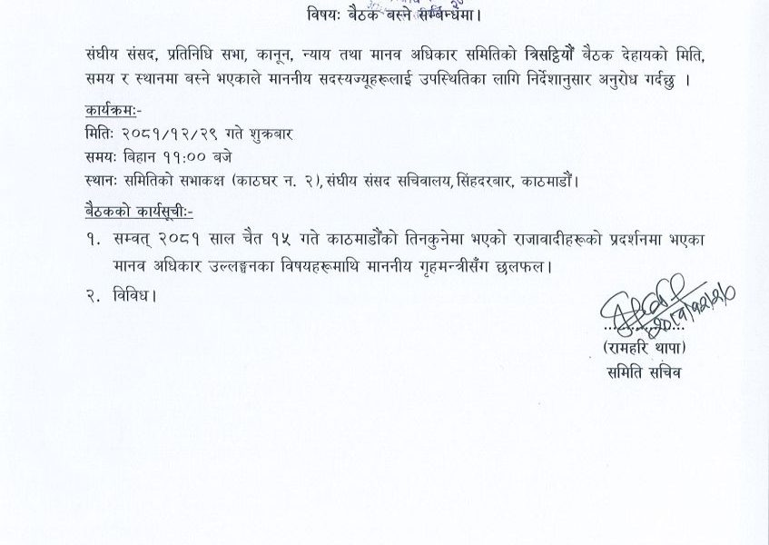 संघीय संसदको एक समितिले गृहमन्त्री रमेश लेखकसँग सोधपुछ गर्ने भएको छ। कानून, न्याय तथा मानव अधिकार समितिले गृह मन्त्री लेखकसँग चैत १५ गते भएको राजावादीहरूको प्रदर्शनका...