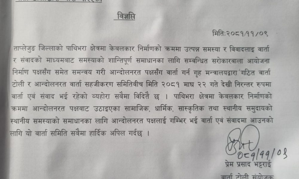 गृह मन्त्रालयले ताप्लेजुङको पाथीभरा मुक्कुमलुङ क्षेत्रमा आन्दोलनरत् ‘नो केबलकार’ समूहलाई वार्तामा आउन पुन: आह्वान गरेको छ। गृह मन्त्रालयले गठन गरेको वार्ता समितिका संयोजक सह-सचिव प्रेमप्रसाद भट्टराईले...