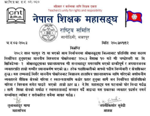 ‘हरेक पदाधिकारीको आफ्नो पदीय जिम्मेवारी र क्षेत्राधिकार हुन्छ । यस तथ्यलाई बिर्सेर माननीय पोखरेलबाट विद्यालय हाताभित्र प्रधानाध्यापक माथि गरिएको अशोभनीय व्यवहारले शैक्षिक क्षेत्रको गरिमा र स्वतन्त्रतामाथि कठोर प्रहार हुनुका साथै जननिर्वाचित प्रतिनिधिको गरिमा र विश्वाससमेत घाइते भएको हाम्रो ठहर छ’,विज्ञप्तिमा उल्लेख छ ।