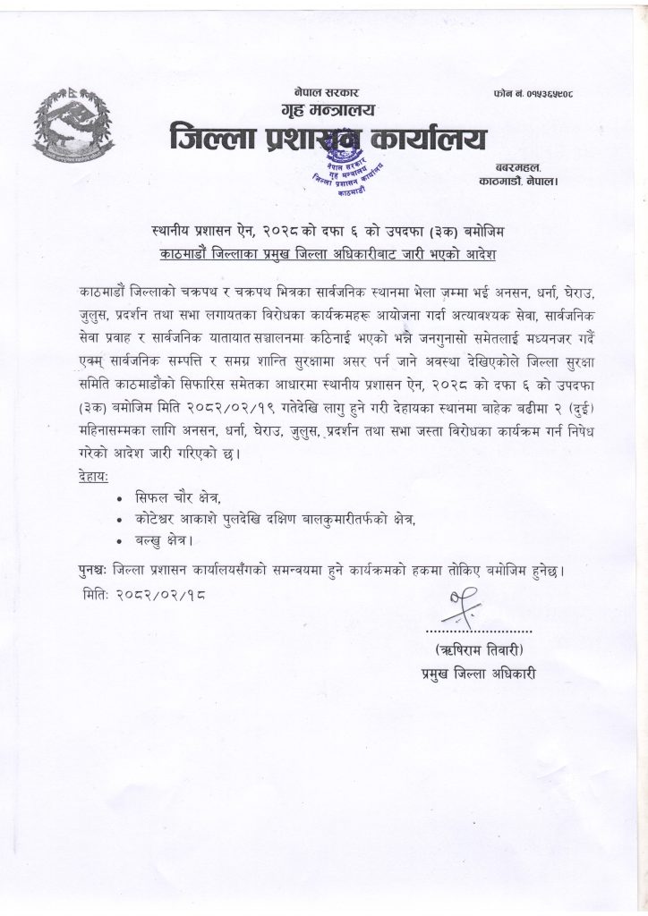 जिल्ला प्रशासन कार्यालय काठमाडौंले सिफलचौर, कोटेश्वर आकाशे पुलदेखि दक्षिण बालकुमारीसम्म र बल्खु क्षेत्र बाहेक अन्यत्रलाई दुई महीनाका लागि निषेधित क्षेत्र घोषणा गरेको हो । निषेधित क्षेत्रमा अनशन, धर्ना, घेराउ, जुलुस, प्रदर्शनलगायतका कार्यक्रम गर्न निषेध गरिएको प्रमुख जिल्ला अधिकारी ऋषिराम तिवारीद्वारा जारी आदेशमा उल्लेख छ ।