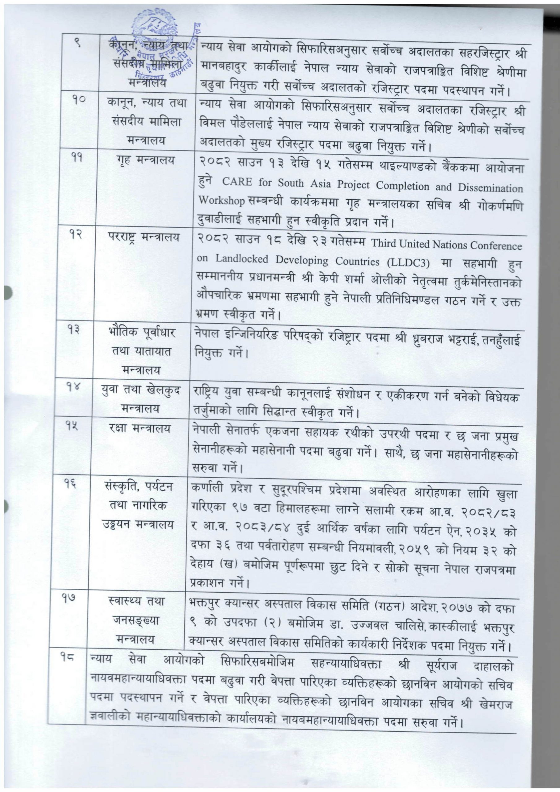 बैठकले न्याय सेवा आयोगको सिफारिस अनुसार सर्वोच्च अदालतका रजिष्टार विमल पौडेललाई मुख्य रजिष्टार पदमा बढुवा गरेको छ । बैठकले नेपाल इन्जिनियरिङ परिषद्को रजिष्टारमा तनहुँका ध्रुवराज भट्टराईलाई नियुक्त गरेको छ भने भक्तपुर क्यानसर अस्पताल विकास समितिको कार्यकारी निर्देशकमा कास्कीका डा।उज्जवल चालिसेलाई नियुक्त गर्ने निर्णय गरेको छ ।