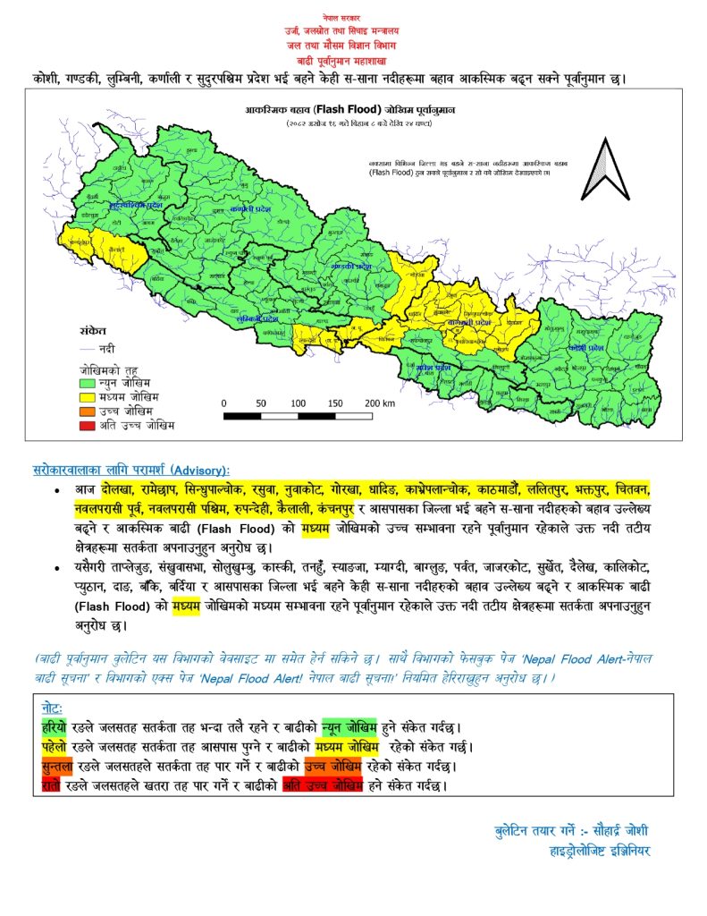 यसैगरी आज दोलखा, रामेछाप, सिन्धुपाल्चोक, रसुवा, नुवाकोट, गोरखा, धादिङ, काभ्रेपलाञ्चोक, काठमाडौँ, ललितपुर, भक्तपुर, चितवन, नवलपरासीपूर्व, नवलपरासीपश्चिम, रुपन्देही, कैलाली, कञ्चनपुर र आसपासका जिल्ला भई वहने ससाना नदीको बहाब पनि उल्लेख्य बढ्ने र आकस्मिक बाढीको मध्यम जोखिमको उच्च सम्भावना रहेको जानकारी बाढी महाशाखाले दिएको छ। काठमाडौँसहित माथि उल्लिखित १७ जिल्लालाई बाढी महाशाखाले पहेँलो रङ अर्थात् एल्लो अलर्ट पनि दिएको छ।